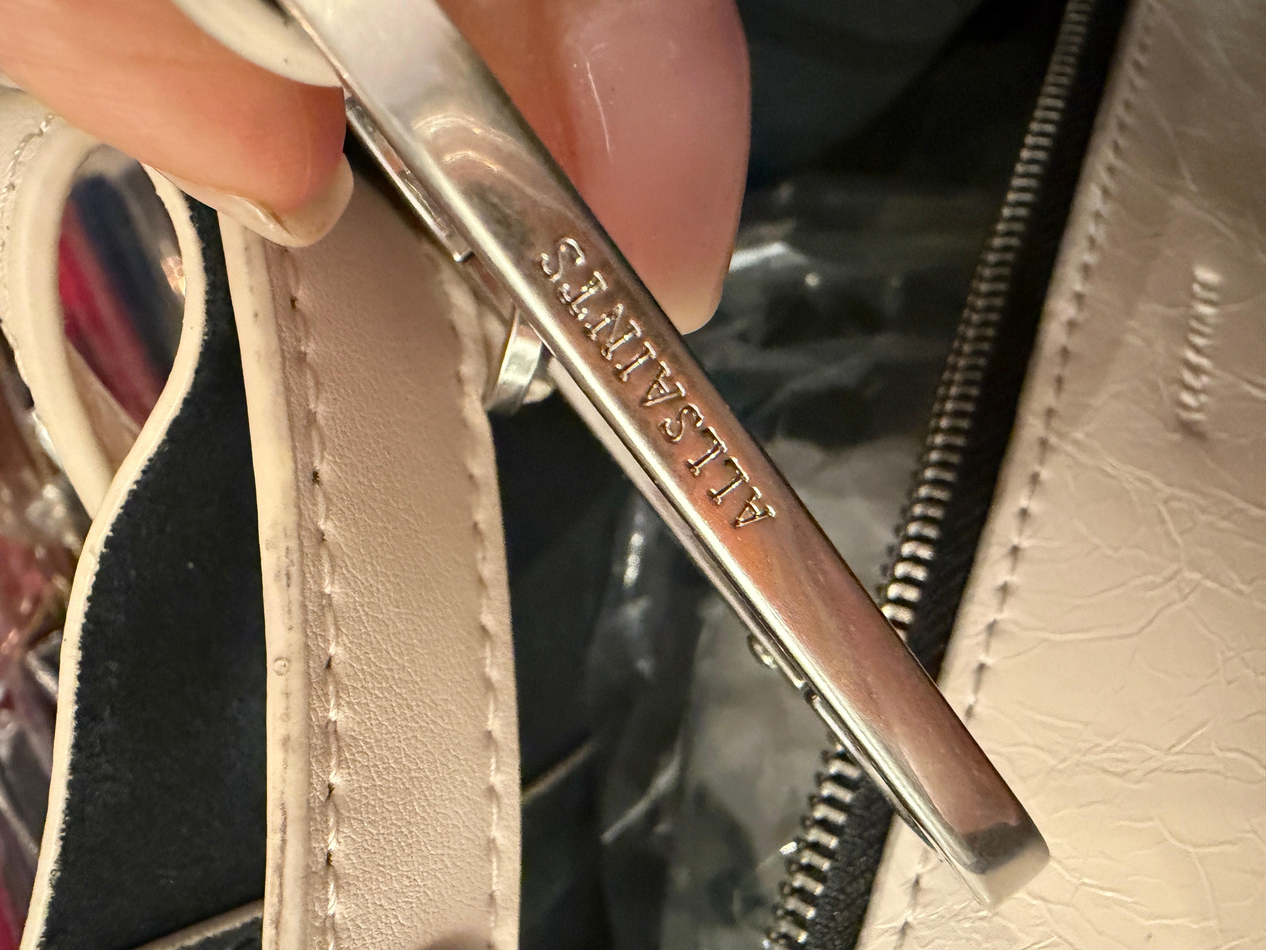 Elevate your accessory collection with the All Saints white leather tote handbag, a masterful fusion of form and function. Its ample silhouette exudes an air of modern sophistication, while the accompanying pouch offers thoughtful organization for your essentials, ensuring your style remains as polished as your pursuits.