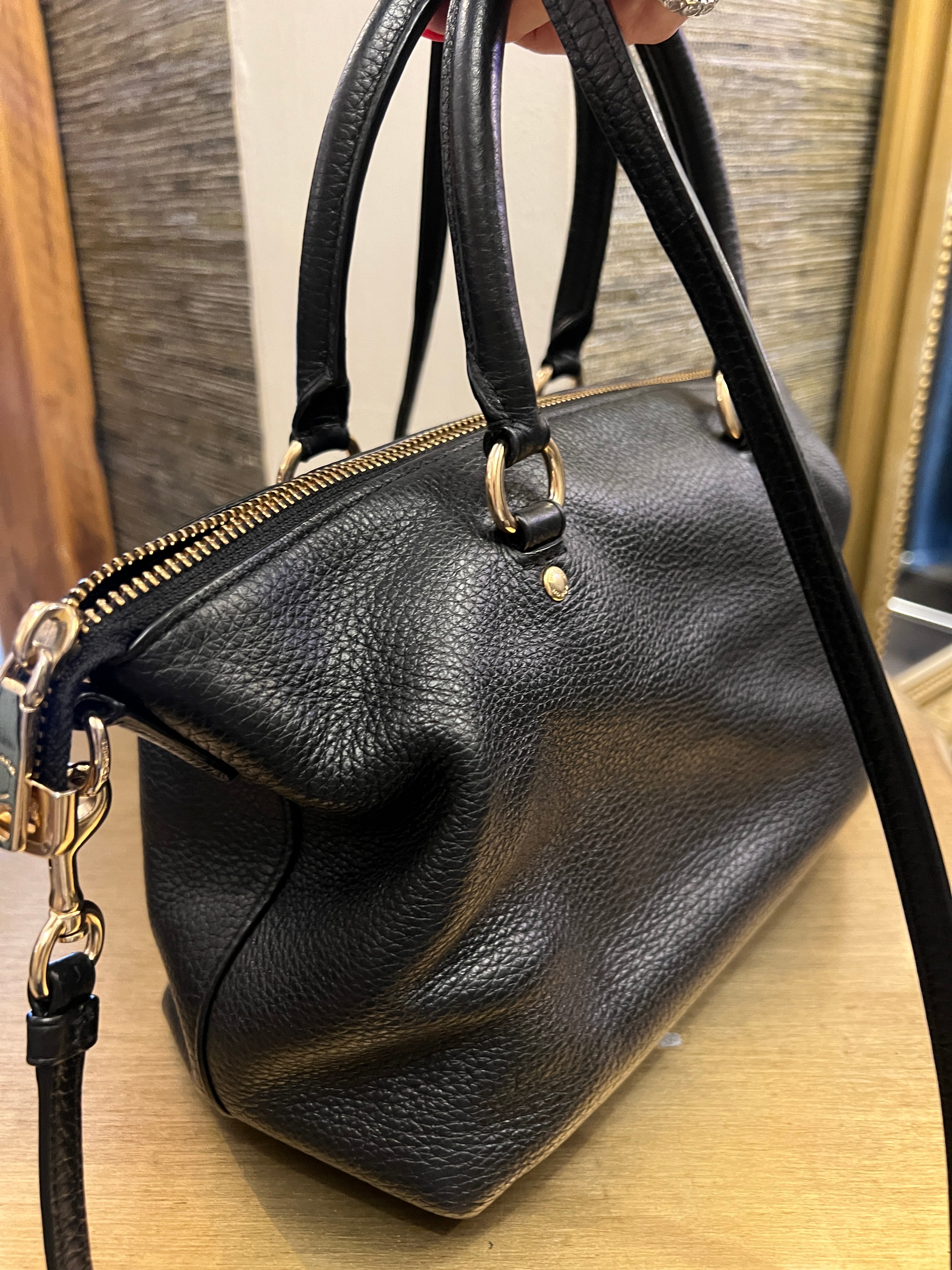 This Coach black mini Emma pebble leather bag is a must-have for any Coach lover. Its premium leather material ensures durability and style, making it a favourite among many. Stay chic and organized with this timeless bag.