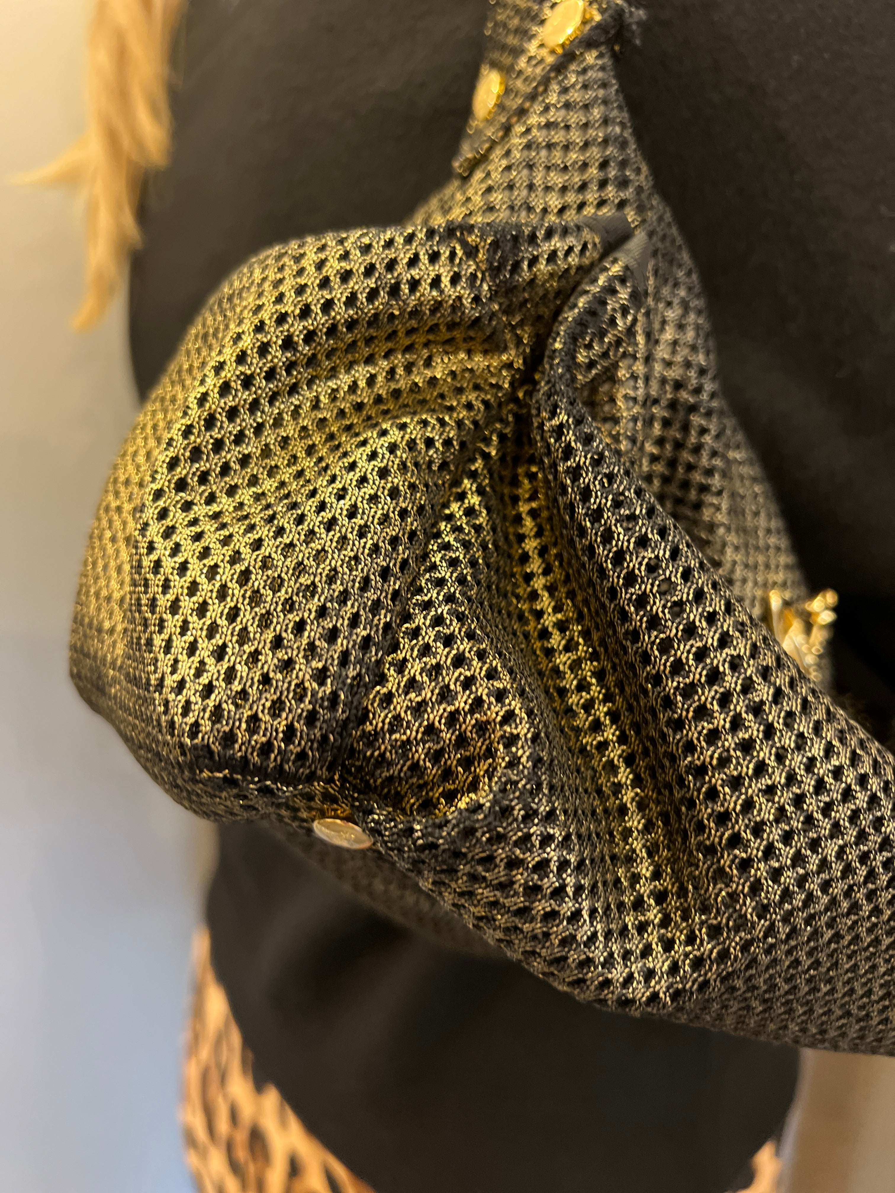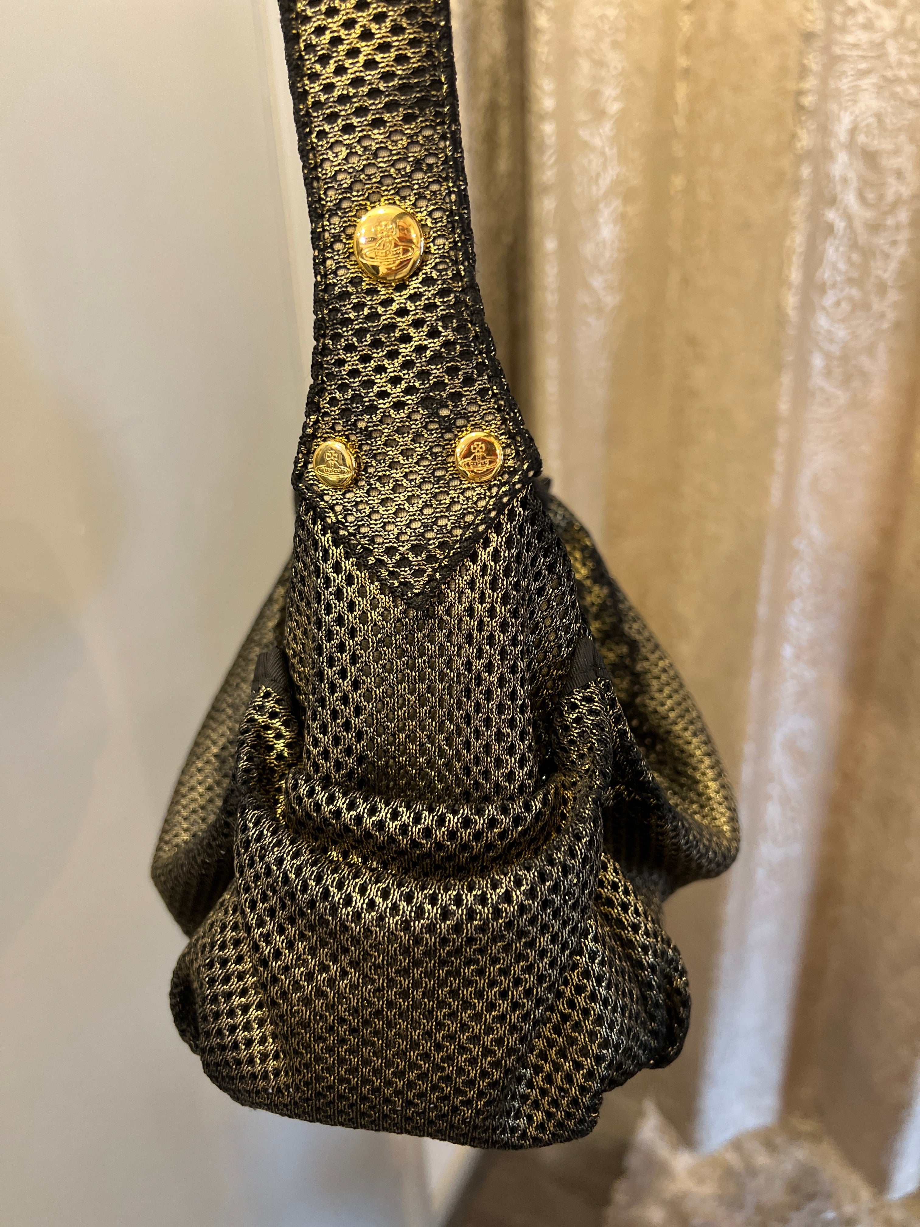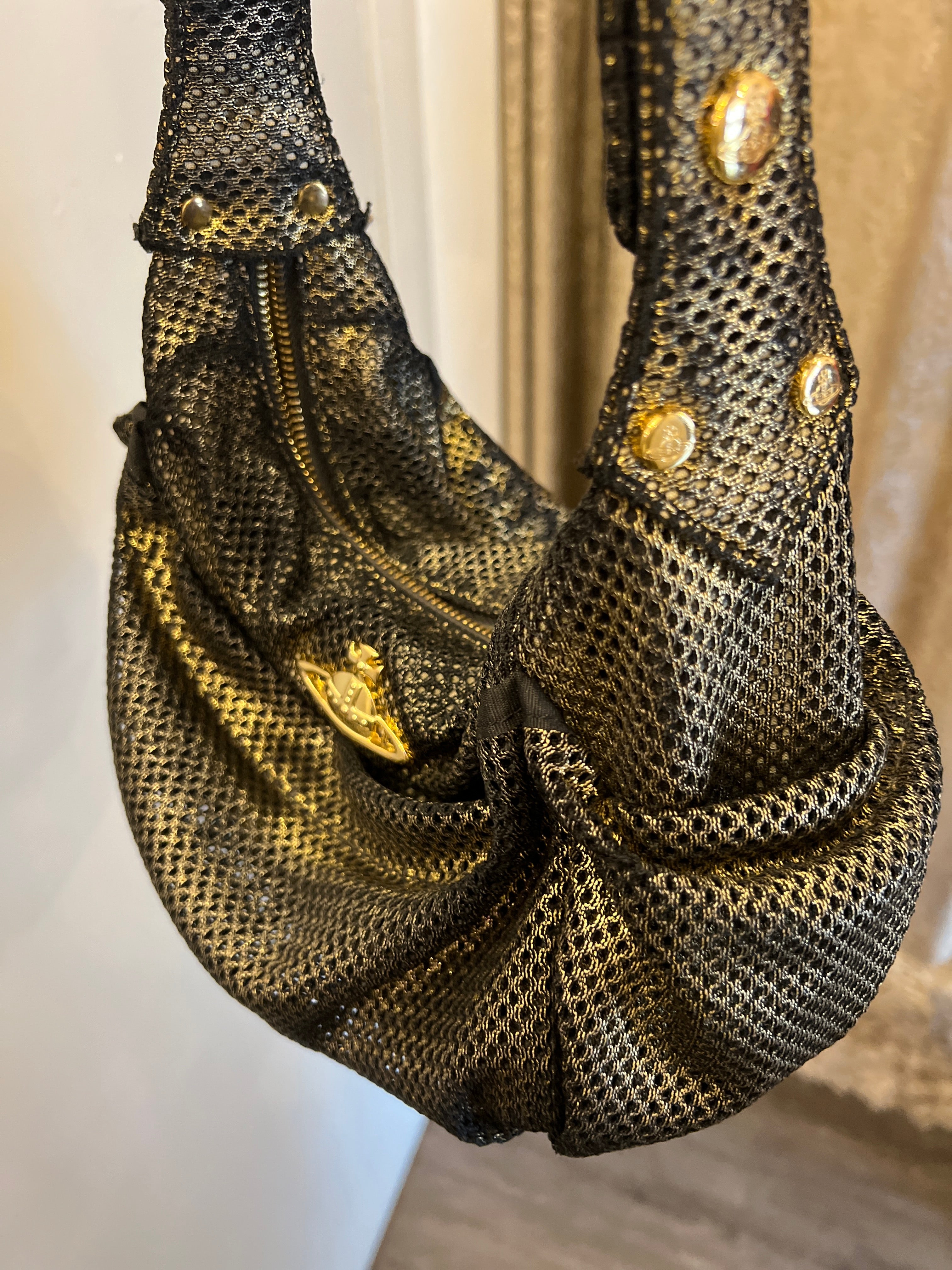 This Vivienne Westwood handbag is the ideal accessory for transitioning from day to night. With its unique gold weave and net design, this bag exudes luxury and sophistication. Perfect for any occasion, it's a must-have for any fashion-forward individual.