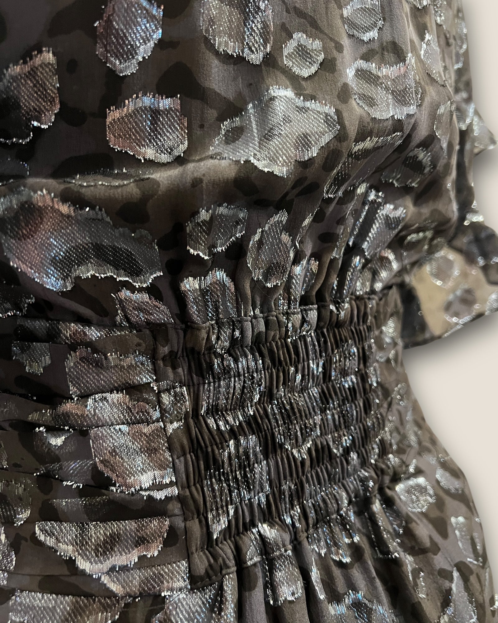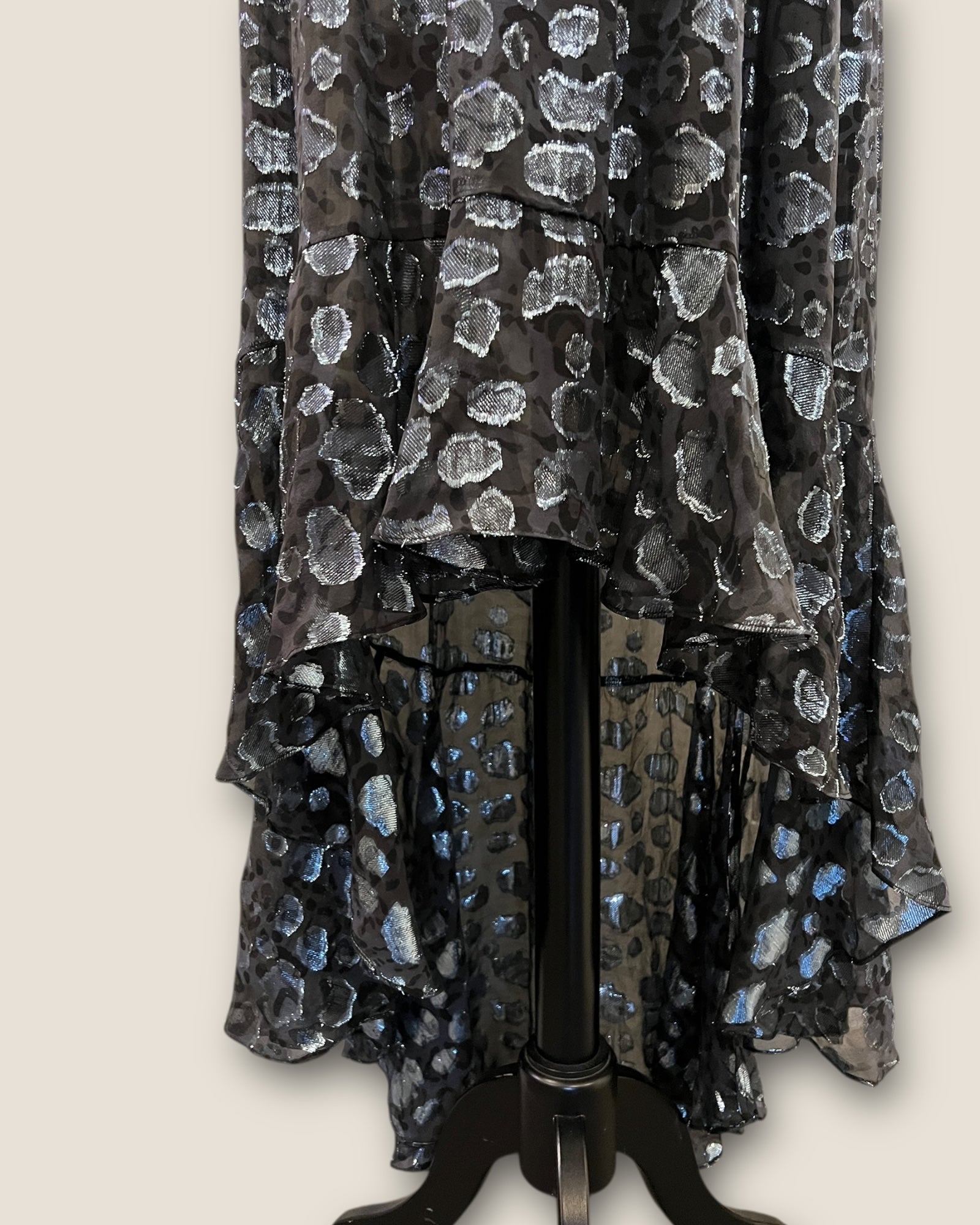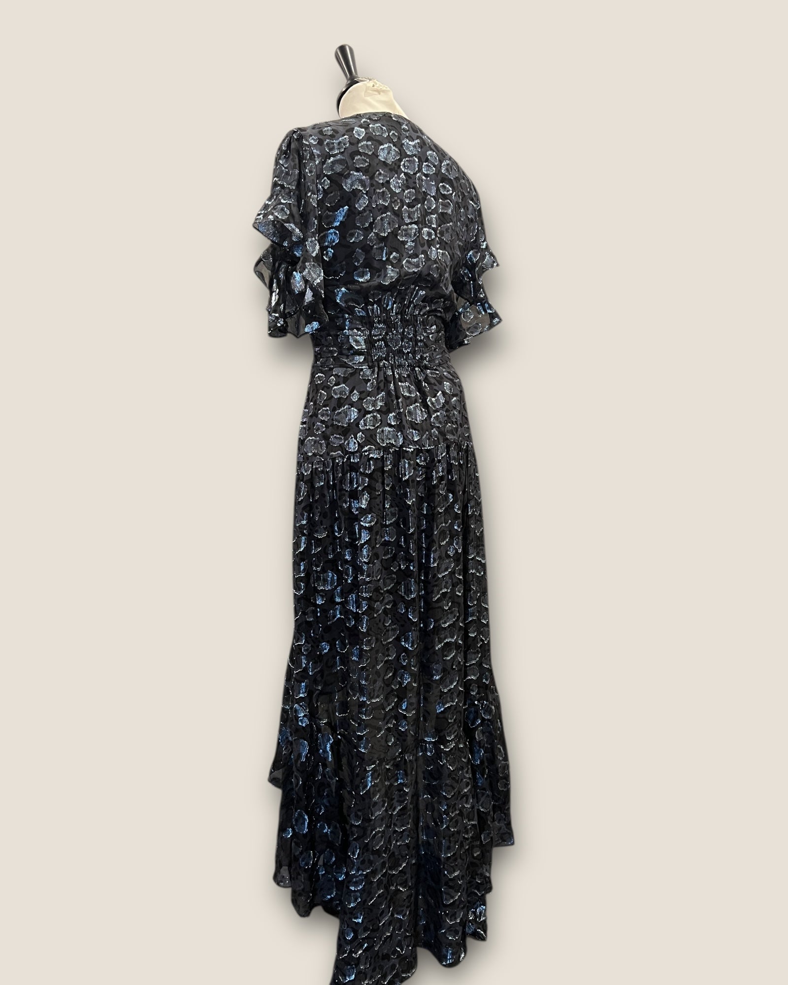 Experience the ultimate in elegance with the BA+SH silver foil ruffle dress in size 1. This stunning dress brings together shades of blue, black, silver, metallic, creating a unique and eye-catching design. The perfect addition to any wardrobe, this dress is sure to turn heads and make you feel confident and beautiful.
