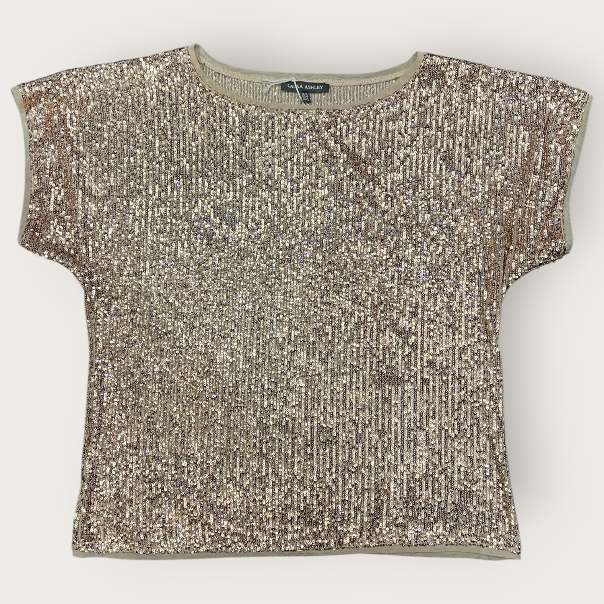 Laura Ashley Gold Sequinned Top Elevate your evening wardrobe with this sophisticated Laura Ashley sequinned top in a lustrous gold finish. Crafted for size M, this pre-owned piece delivers designer appeal without the premium price tag. The shimmering sequin detailing catches the light beautifully, making it perfect for special occasions, celebrations, or when you want to add a touch of glamour to your look. A timeless investment piece that proves luxury fashion needn't be new to be exceptional.