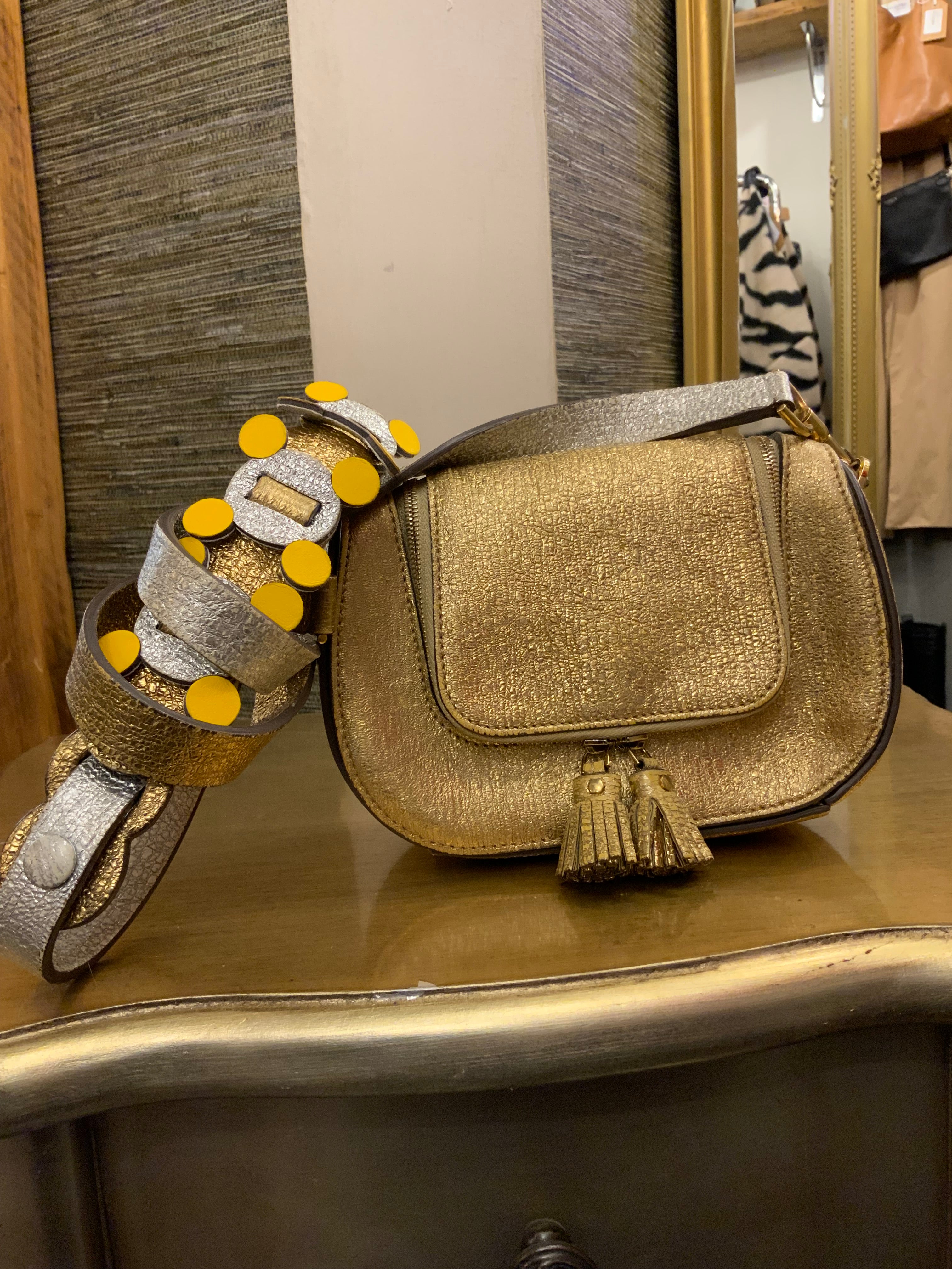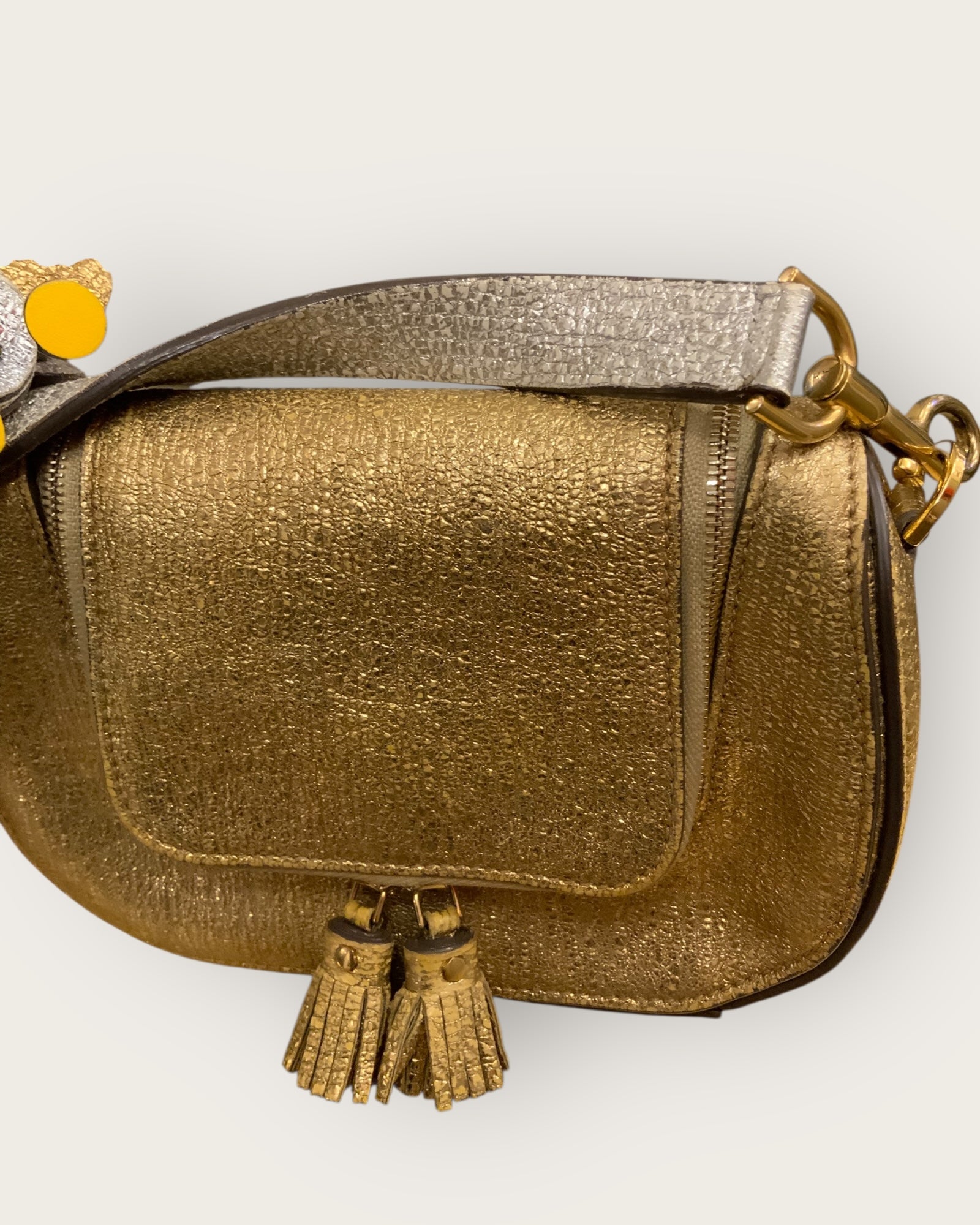 The Anya gold crackle leather mini handbag is a small but stylish accessory for any outfit. Made with high-quality gold leather, it features a unique silver and yellow strap that adds a touch of luxury. Elevate your style with this fabulous handbag. Perfect across the body.