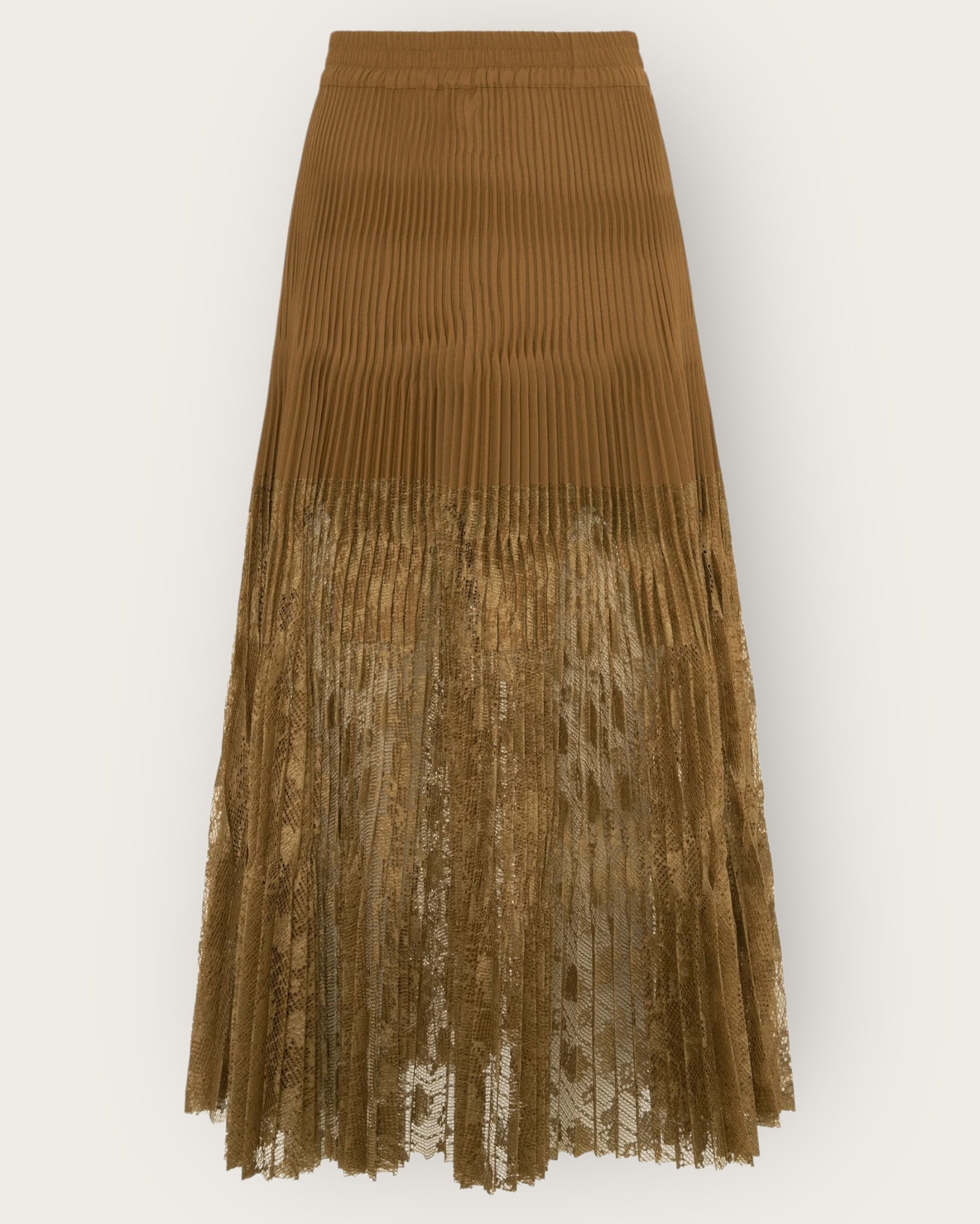 Elevate your wardrobe with this sophisticated Beatrice caramel lace pleated skirt. The delicate lace detailing and graceful pleats create an effortlessly elegant silhouette that transitions seamlessly from day to evening. Whether paired with a crisp blouse for the office or a silk camisole for dinner, this versatile piece offers refined styling possibilities. The warm caramel tone complements a range of complexions and coordinates beautifully with neutral and jewel-toned palettes alike. A timeless investment for the discerning wardrobe.