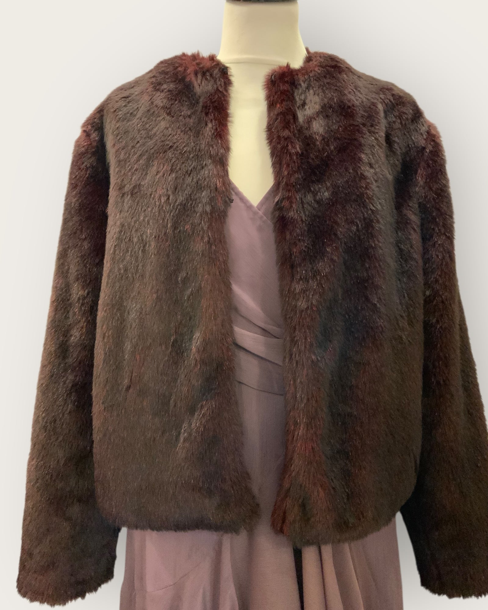 Elevate your special occasion outfit with our FWM Oxblood faux fur crop jacket. Crafted with perfection, the jacket adds a touch of elegance and sophistication. Its luxurious faux fur material provides warmth and comfort, making it the perfect finish to any outfit. Available in size small.